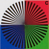 My findings with respect to the SD14's resolving power are about what I expected. Visually, the detail and 3D presence of SD14 photos are amazing, but I wanted to see if I could quantify this a bit. I already knew that as far as resolving power, the 5D would have the edge for black and white detail like that of a resolution chart, but what about the details in colorful subjects? Would things start to fall apart when photographing subjects close to primary colors like red or blue? Instead of looking at horizontal and vertical lines on a typical resolution chart, I chose to use star sector charts as they should be better suited for identifying the point at which both the 5D and SD14 are no longer able to resolve detail reliably. The charts below all start at 500 LPI (lines per inch) at the outer most point where the lines are the thickest. By measuring the distance from the outer edge to the point at which the lines start to blur together, we can calculate maximum resolution. While I confirmed that, as expected, the SD14 was able to resolve the same amount of detail regardless of color, Bayer cameras like the 5D will have more or less resolving power depending on the color being sampled.