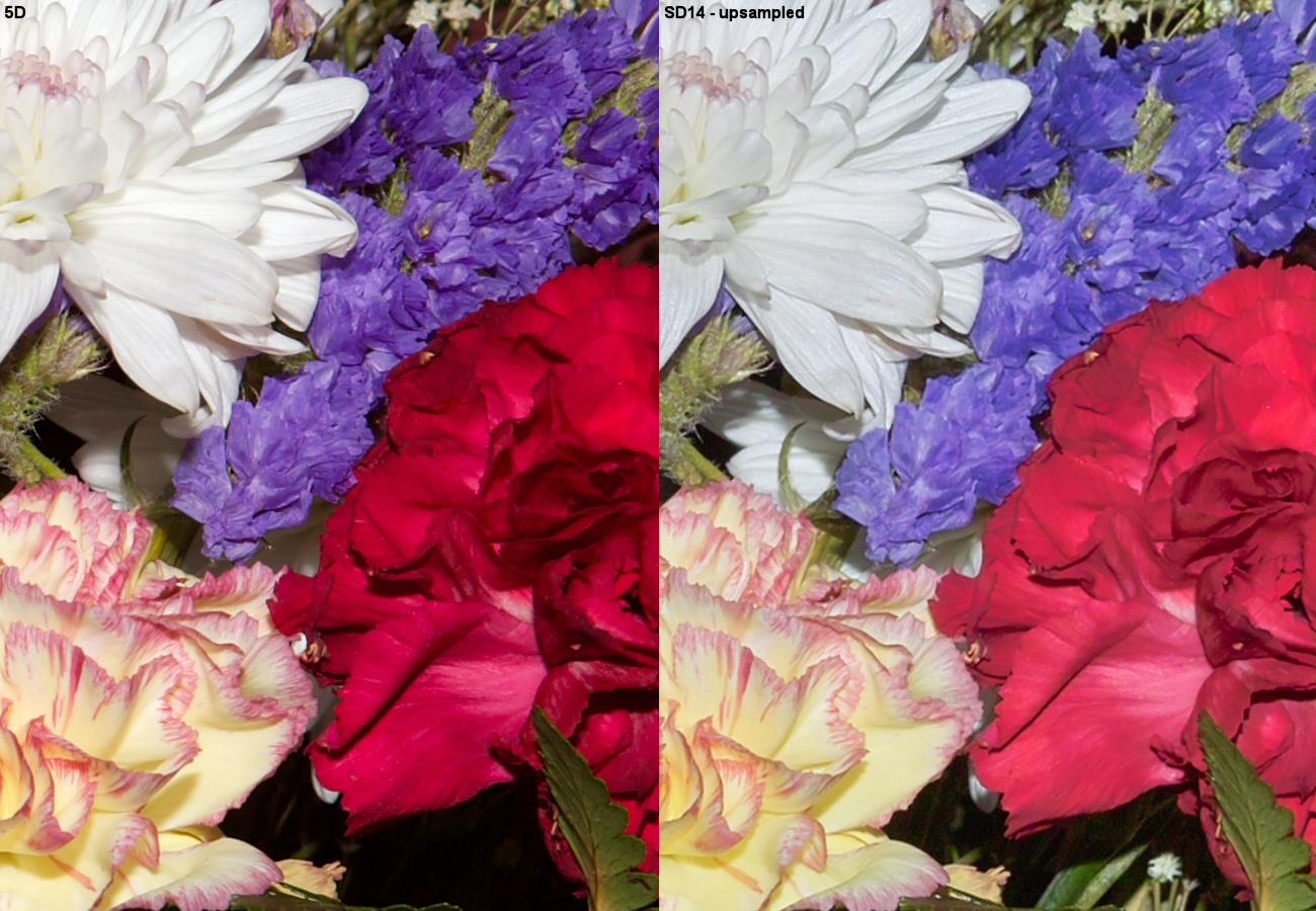 On the surface, it may seem unlikely that a 4.6 megapixel image upsampled to 12.7 MP can look as good or better than one that started as 12.7 MP but the proof is in the shooting! Even though the SD14 photo on the right above started as a much smaller image, when upsampled to match the resolution of the 5D, it holds up very well, easily matching the 5D in most areas while surpassing it in others. Where the SD14 holds consistent sharpness across the frame, the 5D has smudged over a bit of detail in areas notoriously problematic for Bayer sensors such as the red carnation and even the white flower where edge detail is being lost to the AA filter. Looking at the 5D shot, you'd be tempted to believe that the red flower is just a little out of focus because it's in front of (or behind) the other flower due to it not looking as sharp. In reality, all the flowers in the above crop are in the same plane relative to the lens. In addition, the shot was taken from a distance at f/11 so much of the depth of field is quite forgiving as well.