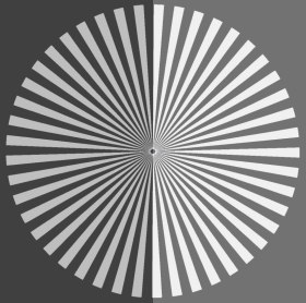 In figure 3, we have added contrast to the right half of both images.  As you can see, the white/red spokes have gotten brighter while the background has gotten darker.  This causes the image to look more defined.  By making the highlights brighter, however, we've also increased the brightness of the spokes, causing the image to appear brighter since the spokes are the main focus of the image.  On the red image, increasing the brightness of the spokes has also increase saturation (defined below).  Finally, sharpness has also been increased on both images (also defined below).  Here, we have increased brightness, contrast, saturation, and sharpness simply by adding contrast!  Note that not all areas of the image will be affected equally and a lot depends on the content of the image itself.  Saturation effects, for example, will be less noticeable in images that don't show bright colors because there is very little saturation to begin with.  As an extreme example, take a look at the B/W image above.  Since B/W images have zero saturation by definition, changing contrast cannot change saturation in B/W (gray) areas of your image.